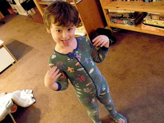 There have been some bumps. Yes, he did headbutt a teacher...but she MAY have been asking for it. Law & Order PRESCHOOL UNIT is still looking into it. And he has taken to wearing his old pajamas that do NOT fit anymore: